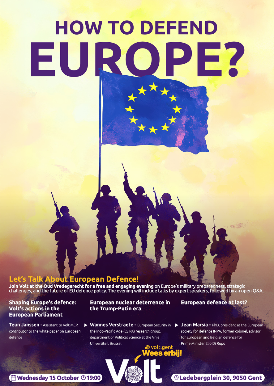 Venez participez à l’événement « How to defend Europe » vendredi 15 Octobre à Ledebergplein 30, 9050 Gent en présence de Teun Janssen – Assistant to Volt MEP, contributor to the white paper on European defence; Wannes Verstraete – European Security in the Indo-Pacific Age (ESIPA) research group, department of Political Science at the Vrije Universiteit Brusse et Jean Marsia – PhD, president at the European society for defence INPA, former colonel, advisor for European and Belgian defence for